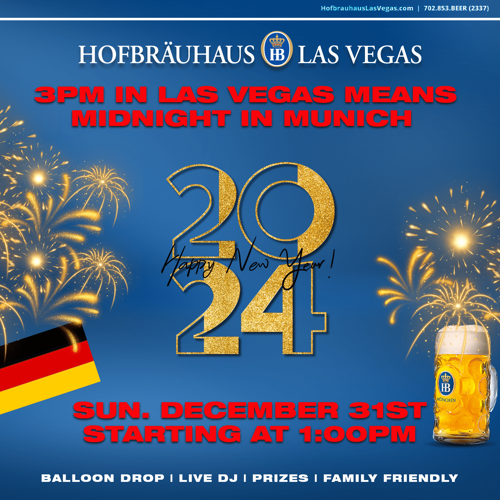 December 31 - December 31Come to our Haus and celebrate midnight in Munich, which is 3:00PM Las Vegas time, with us!