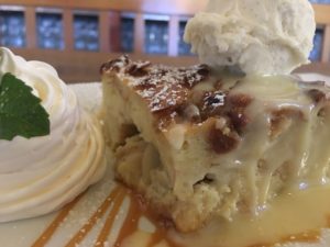 Bread and butter pudding – Served with vanilla ice cream, whiskey sauce, and whipped cream
