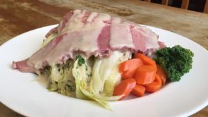 Traditional corned beef and cabbage – Tender corned beef brisket served with steamed cabbage, carrots and mashed potatoes