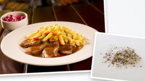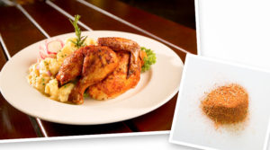 We put this blend of seasonings on our Grillhendl, otherwise known as our half chicken dish. This savory spice features paprika powder, rosemary, salt and white pepper.