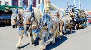 At 11 am on the dot the parade, led by the Münchner Kindl (the little Munich city’s coat of arms), enters the grounds on the Wies’n (short for Theresienwiese, or Therese’s fields after Bavaria’s famous bride). The mayor arrives in a festive coach followed by civic dignitaries and horse-drawn brewer’s carts decorated with flowers.