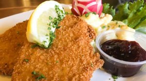 The Vegetarian Schnitzel (Vegetarisches Schnitzel) is a meat-free schnitzel made with soy protein and tempting spices, breaded and complemented with cranberries. This 100% vegan option is served with French fries and a crisp cucumber salad.