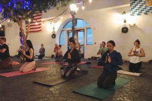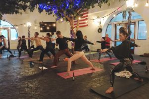 At the start of class, participants set up their mats and receive a beer of their choice. Our options include the Hofbrau Original, Dunkel, or Hefe Weizen. It is a good idea to show up 5-10 minutes early to do some solo stretching before class. Once everyone receives a bottle of beer, the one-hour class begins. Afterward, stick around for dinner! We have Vegetarian, Vegan, and Gluten-Free options available for those who want to keep the healthy vibes flowing.