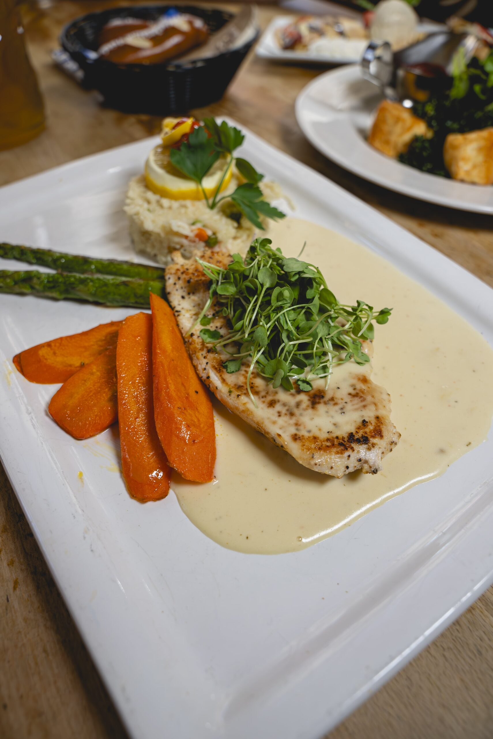 Sautéed chicken breast topped with creamy lemon sauce, served with rizi bizi (rice and green peas), mushrooms, garden spring vegetables, and garnished with lemons