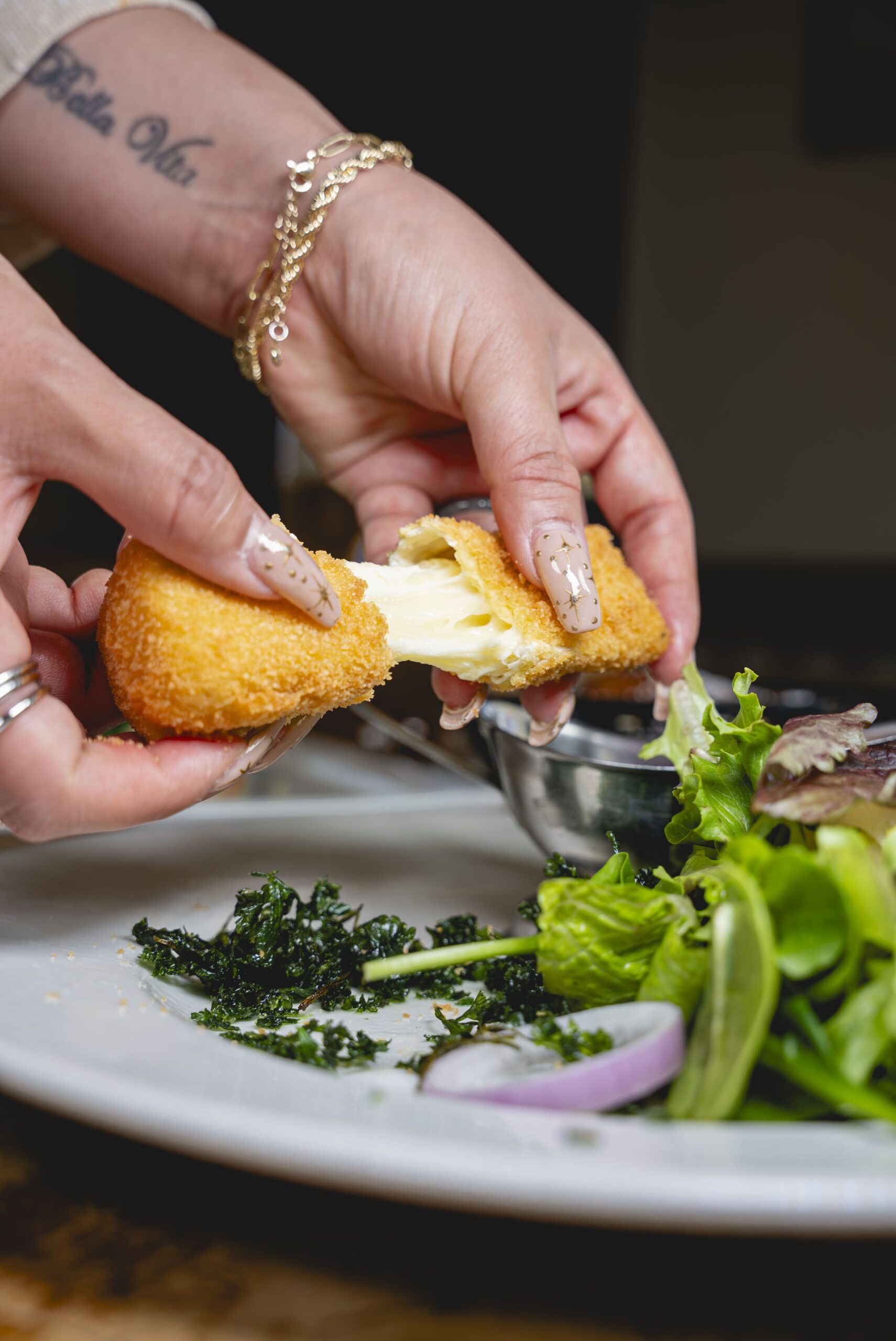 Golden-brown baked Brie cheese served with summer greens, balsamic dressing, and Cumberland sauce, garnished with fried Italian parsley