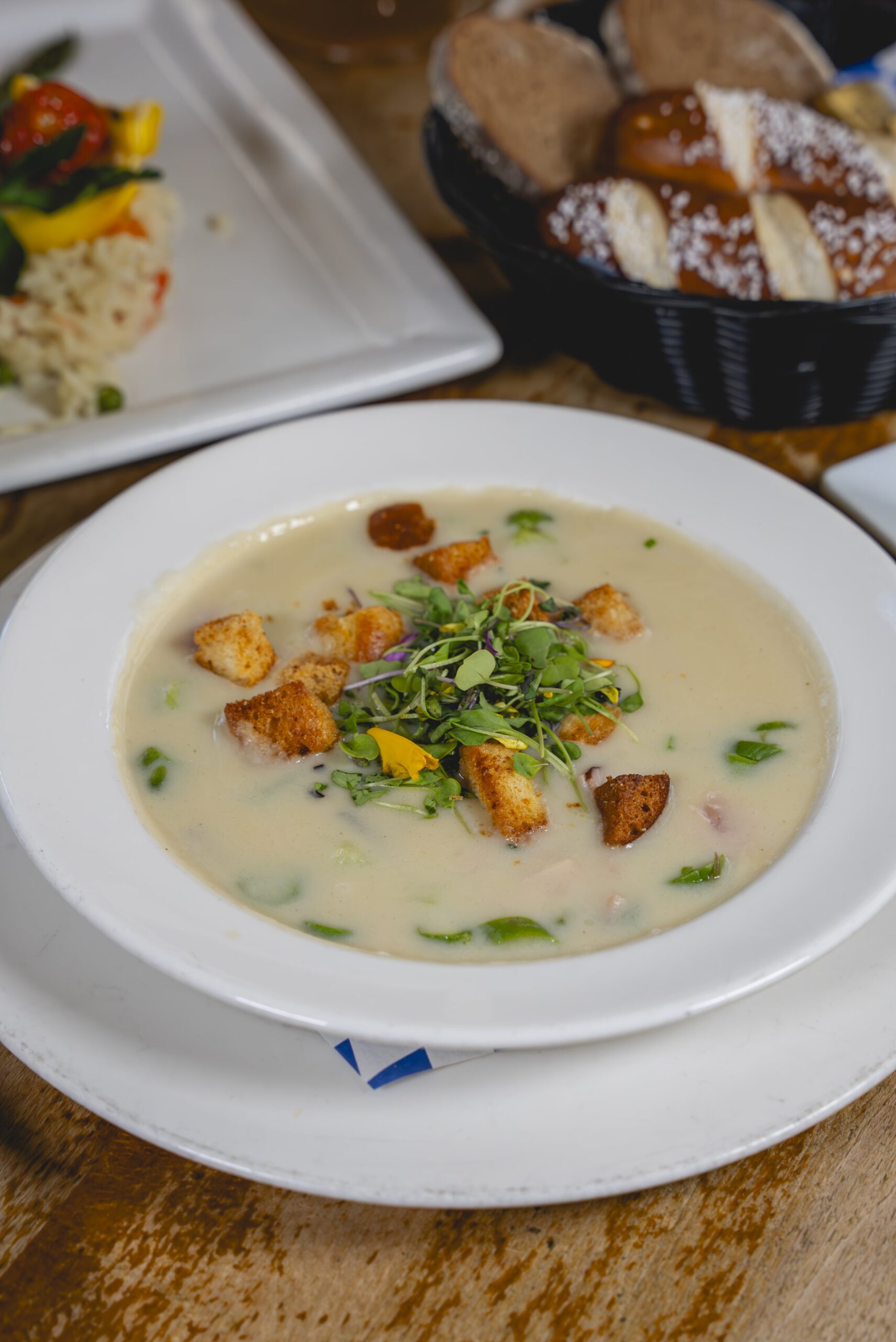 Cream of asparagus soup garnished with croutons and chives.
