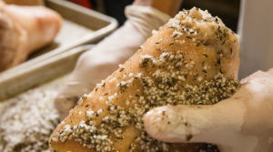 We then marinate each pork shank in our secret blend of spices, including chunks of the amazing pretzel salt you’ll find on our twisted temptations.