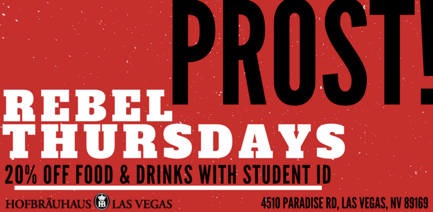 We want to show our support for our UNLV Rebels by offering 20% off food and drinks (including BEER) every Thursday! Students must bring their student ID card to our restaurant to receive this promotion.