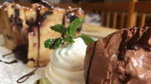 We save the best for last! This delicious treat is served with chocolate ice cream, holiday spiced cherries, and whipped cream.