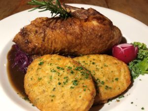 When you’re ready for the main course, our quarter-roasted duck is the perfect choice. It’s stuffed with onions, apples, and oranges and served with potato roesti, red cabbage, and orange sauce. Yum!