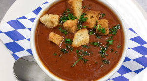You can choose to begin your feast with this famous soup, garnished with croutons and chives.