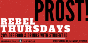 We are proud to announce our launch of Rebel Thursdays! We want to show our support for our UNLV Rebels by offering 20% off food and drinks (including BEER) every Thursday! Students must bring…