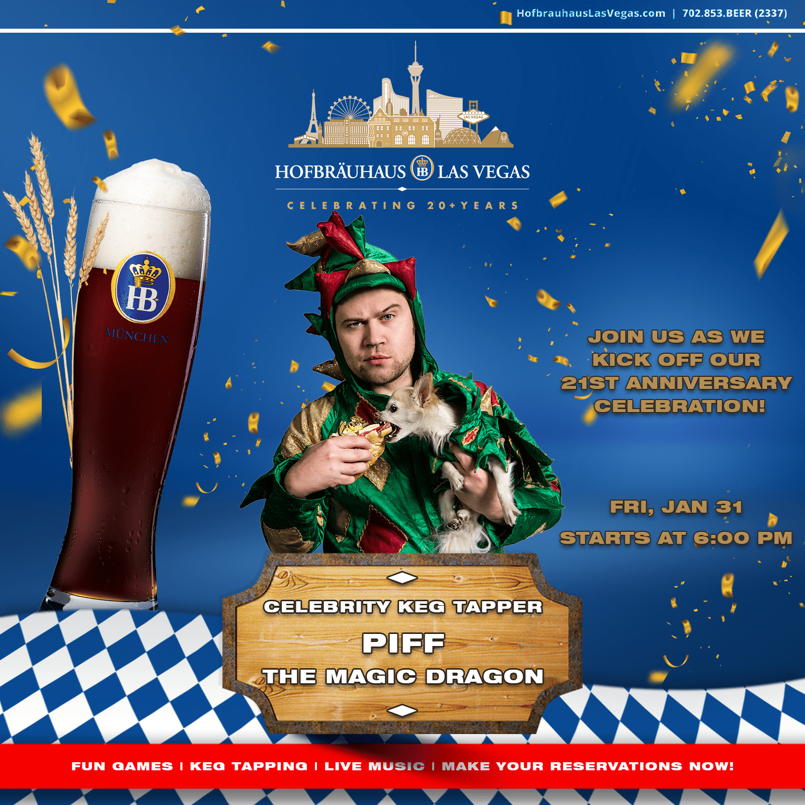 Hofbräuhaus Las Vegas Turns 21! Join us Friday, Jan. 31, as Piff the Magic Dragon taps the first keg of dark wheat beer at 7:30 PM. Celebrate with Bavarian fun, music, and surprises! Prost!